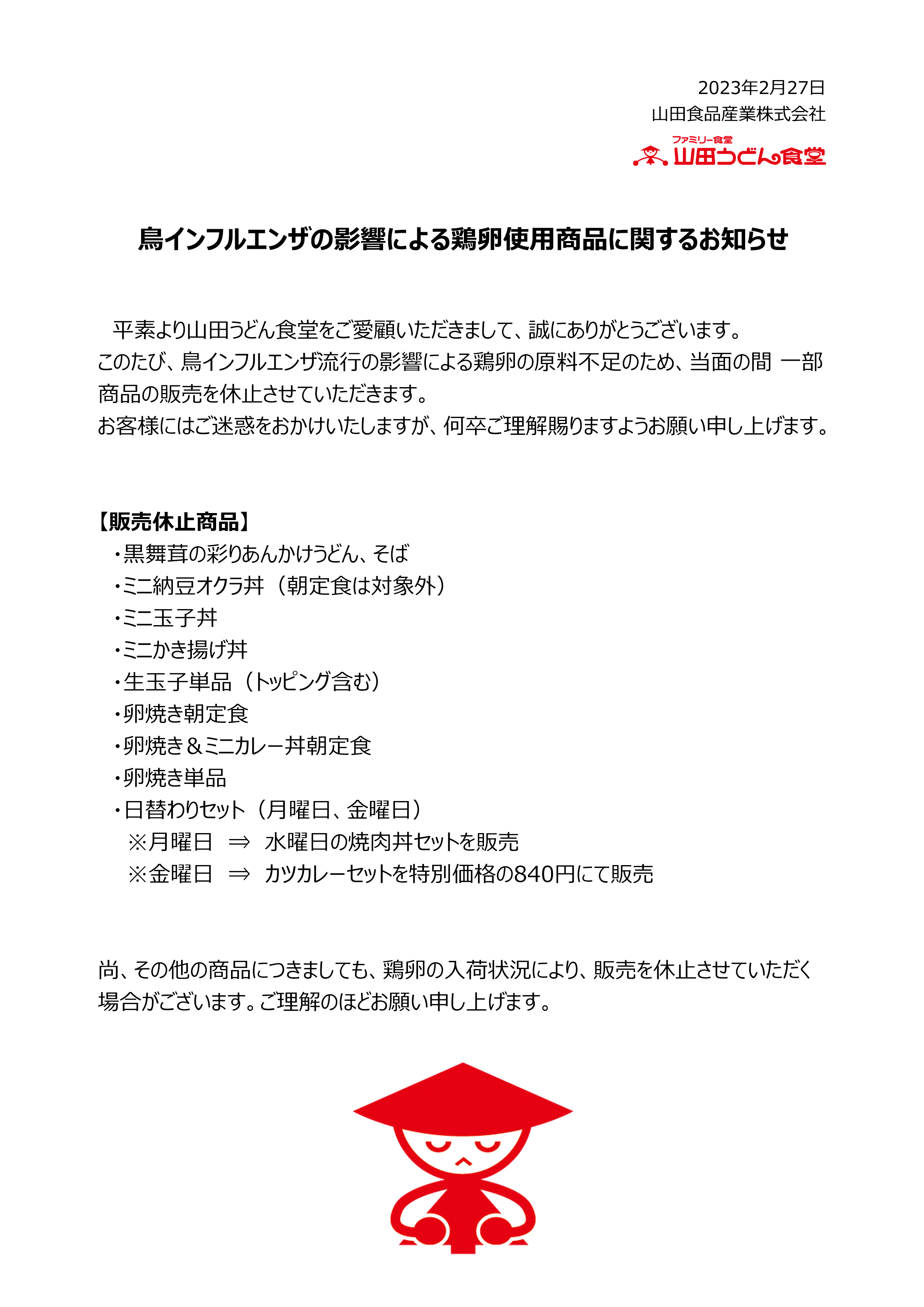 埼玉県内を中心に関東地方で、うどんを主力にする外食レストランチェーン「ファミリー食堂 山田うどん食堂」を展開する山田食品産業が27日、鳥インフルエンザ流行の影響による鶏卵の原料不足のため、当面の間一部商品の販売を休止すると発表しました。
