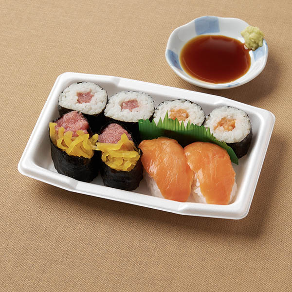 「まぐろ&サーモン寿司セット」は、とろたく軍艦、サーモンにぎり、ねぎとろ巻寿司、サーモン巻寿司の4種類が楽しめる寿司セットです。