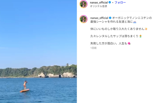 菜々緒さんは「オーガニックでノンニコチンの最強シーシャを作れる友達と海に。体にいいものしか取り入れたくありません」と綴り、シーシャを満喫する様子や、「久々レンタルしたサップは落ちまくり」とサップに挑戦し海に落ちるシーン、浮輪でリラックスする姿などを収めた動画を投稿しています。