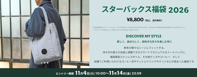 スターバックス コーヒー ジャパンが、「スターバックス福袋 2026」のオンライン抽選エントリーを2025年11月4日(火)10:00~11月14日(金)23:59まで受付けます。価格は8,800円(税込・送料無料)。なお、当選数は非公開。