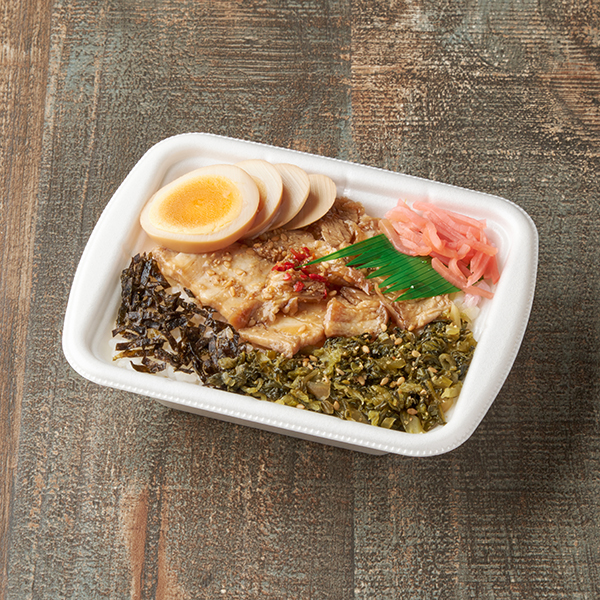 「チャーシューごはん」は甘めのタレを絡めた直火焼のチャーシューとごま高菜・ゆでたまごを盛り付けた小容量のチャーシューごはんです。