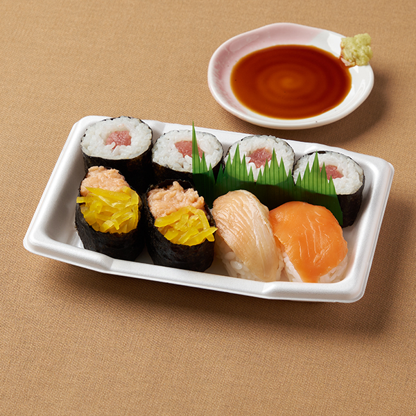 「まぐろ&サーモン寿司セット」はサーモンたくあん軍艦・焼きハラスにぎり・サーモンにぎり・ねぎとろ巻寿司の4種類が楽しめる寿司セットです。