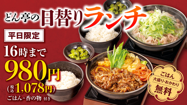 どん亭らしい“鍋仕立て”にこだわり、ご飯と香の物がついた満足度の高い鍋膳メニューとして提供するとのことです。ご飯の大盛り、お替り無料です。同社は「安心感と手軽さを兼ね備えた『日替わりランチ』で心もお腹も満たされるランチタイムを、ぜひお楽しみください」と呼びかけています。