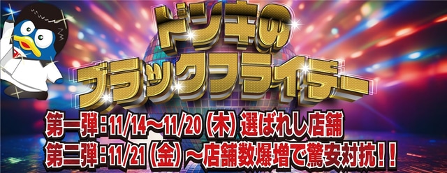 今年の「ドンキブラックフライデー」は、11月14日(金)からの第一弾は「選ばれし店舗」で、11月21日(金)からの第二弾は「店舗数爆増」で実施されます。