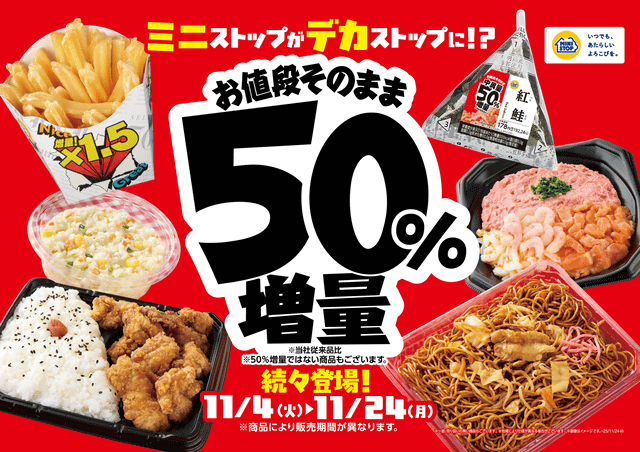ミニストップが、日頃の感謝の気持ちを込めて「ミニストップがデカストップに!?」と題して、2025年11月4日(火)から順次、お値段そのままで増量商品を発売しています。