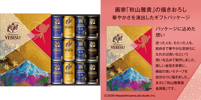 歳暮期限定のヱビスビール、ヱビス 和奏、ヱビス プレミアムブラック、ヱビス プレミアムエールの4種12本のセット。画家・秋山雅貴氏の描きおろしの華やかさを演出したギフトパッケージで、秋山雅貴氏はパッケージに込めた想いを「送った人も、もらった人も、前向きで華やかな気持ちになれれば良いなという想いを込めて制作しました。美しい金箔を背景に、縁起の良いモチーフを自分なりに描きました。まさに『秋山雅貴版金屏風』です」と語っています。