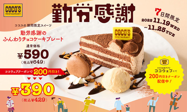 ゼンショーグループのファミリーレストラン「ココス」が、「勤労感謝のふんわりチョコケーキプレート」を2025年11月19日(水)~11月25日(火)23:59の7日間限定で販売しています。価格は590円(税込649円)。持ち帰りはできません。ココス公式アプリ「ココウェブ」に登録すれば、390円(税込429円)で購入できる「200円引きクーポン」が配信されており、他のクーポン券との併用もできます(パーセント割引は対象外)。なお、空港店舗では利用できません。
