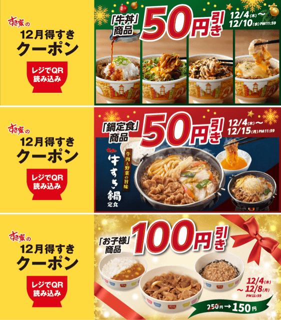 牛丼(並)は50円引きで税込400円! すき家が「牛丼税込50円引き」「鍋定食税込50円引き」「お子様商品税込100円引き」の「12月得すきクーポン」第2弾を明日4日(木)から配信