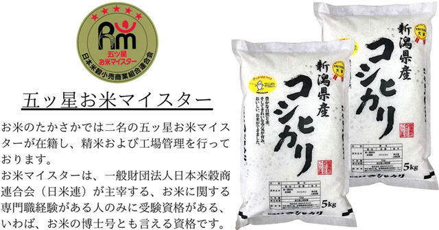 お米のたかさかでは、五ッ星マイスターが在籍し、精米および工場管理を行っています。お米マイスターは、一般財団法人日本米穀商連合会(日米連)が主宰する、米に関する専門職経験がある人のみに受験資格がある、いわば、お米の博士号とも言える資格です。