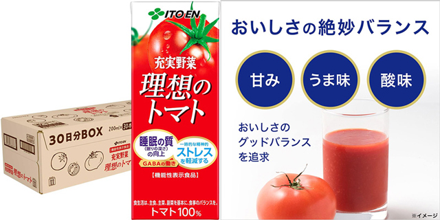 Amazon.co.jp限定「充実野菜 理想のトマト 紙パック」が13%OFF! トマト由来のGABAの働きが「睡眠の質の向上」と「一時的な精神的ストレスの軽減」することが報告されています