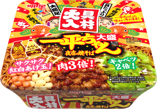 肉3倍、キャベツ2倍、サクサク紅白あげ玉の“ド派手な一平ちゃん”で年末年始を華やかに! 30周年の感謝を込めた「明星 一平ちゃん夜店の焼そば 大盛 具材大入」が発売