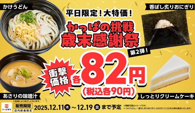 店内飲食限定「かっぱの挑戦 歳末感謝祭」第2弾!「味噌汁」「クリームケーキ」「おにぎり」「うどん」各82円(税込各90円) 概要