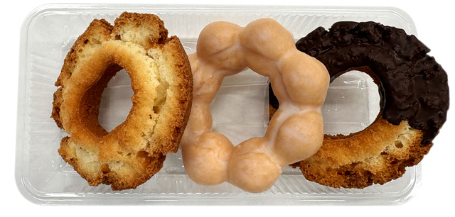 「アソートドーナツ 3個入り」は、オールドファッション、もちもち食感リングシュガー、チョコオールドファッションの3種類が入ったドーナツのアソートです。熱量は1,077kcal。たんぱく質 7.6g、脂質 77.3g、炭水化物 88.6g(糖質 86.8g、食物繊維 1.8g)、食塩相当量 1.2g。