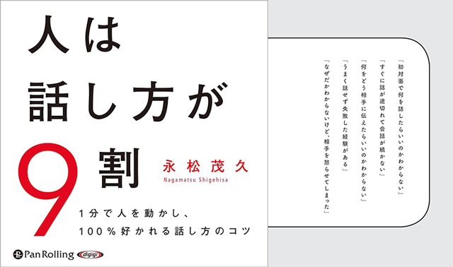 Audibleプレミアムプランでは現在、「人は話し方が9割」(著:永松茂久)のAudible版(ナレーション:横居将)も聴き放題となっています。