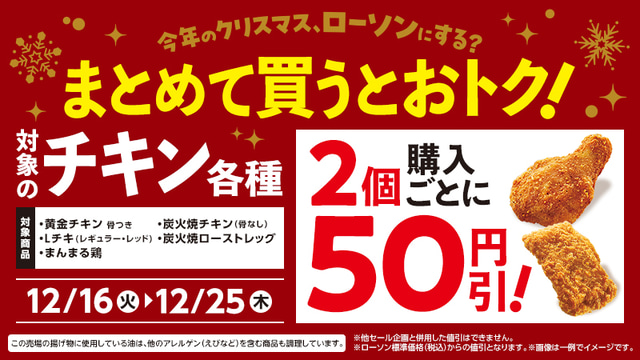 ローソンで「炭火焼ローストレッグ」や「黄金チキン 骨つき」など対象チキンを2個一緒に買うごとに税込50円引!