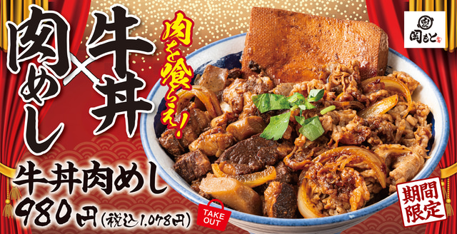 秘伝のかえしとこだわりの割り下で丁寧にじっくり煮込むことで、コクのある味わいに仕上げた看板メニュー「肉めし」に、牛肉の旨みと玉ねぎの甘みが際立つ牛丼の具を合わせ、二つの肉料理を一杯に豪快に盛り付けています。じっくり煮込んだ肉の深いコクと、牛丼ならではのジューシーな旨みを同時に味わえる、食べ応えのある一杯で、さらに、もっと食べたい人には肉量を1.5倍にした「肉盛り!牛丼肉めし」も用意されます。