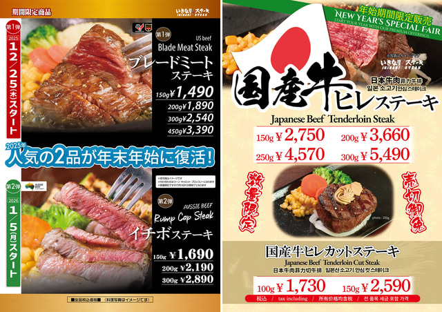 2025年に人気の「ブレードミート」と「イチボ」が復活! 「国産ヒレ」が特別価格! いきなり!ステーキが「年末年始フェア」を本日25日(木)から開催