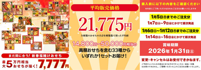 予約キャンセル分や予備在庫調整のため、14,800円~50,000円(税込)相当の33種(平均税込21,757円)のおせちから1セット届きます。なお、賞味期限は2026年1月31日(土)となっています。