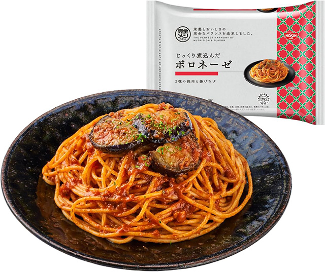 「冷凍 完全メシ DELI じっくり煮込んだボロネーゼ」は、牛と鶏のひき肉と揚げなす入りのボロネーゼです。じっくり煮込んだ牛肉と香味野菜のうまみをきかせたコク深い味わいのソースが、パスタに絡みます。