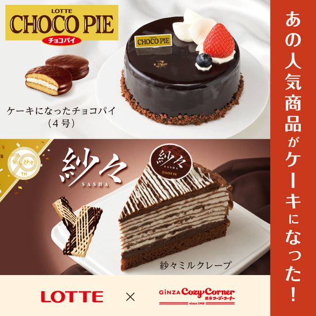 ロッテ「チョコパイ」がリッチなホールケーキに! 銀座コージーコーナーがより華やかにご褒美感がアップした「ケーキになったチョコパイ(4号)」を今年も発売~「紗々ミルクレープ」も同時発売