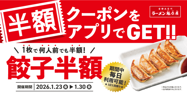 魁力屋がチェーン展開する「京都北白川ラーメン魁力屋」が、「餃子半額キャンペーン」を2026年1月23日(金)~1月30日(金)まで開催します。