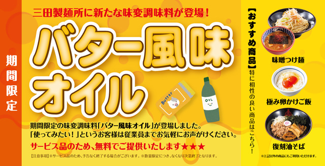 【三田製麺所】追加料金0円!味変「バター風味オイル」お試し提供中!https://t.co/fV9YDAr43x@PRTIMES_JPより
