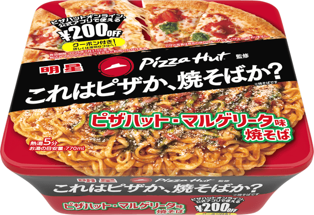 これはピザか、焼そばか? 「ピザハット」が徹底監修でもはやピザの味わいのカップ焼そば! 「明星 ピザハット監修 ピザハット・マルゲリータ味焼そば」を本日26日(月)発売~ピザハットのクーポンもついてくる!