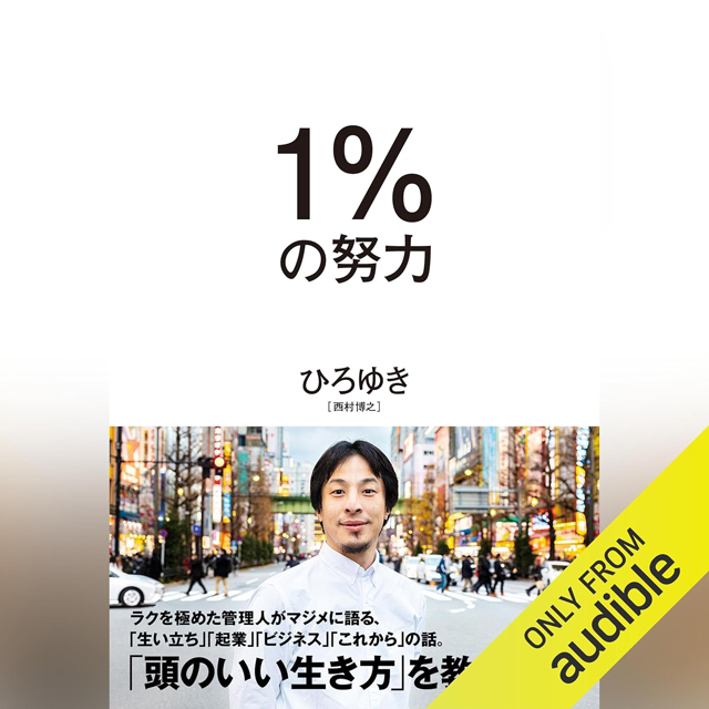Audibleプレミアムプランでは現在、「1%の努力」(著:ひろゆき)のAudible版(ナレーション:川勝亮太郎)も聴き放題となっています。