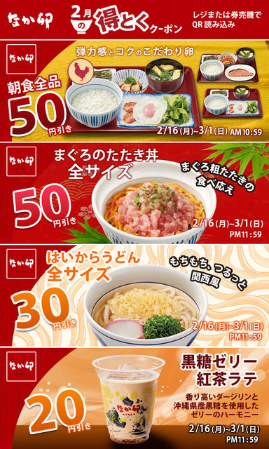 対象期間中、クーポンを利用すると朝食商品を50円(税込)引き、まぐろ丼商品を50円(税込)引き、はいからうどんなどのうどん商品を30円(税込)引き、黒糖ゼリー紅茶ラテを20円(税込)引きで楽しめます。同社は「ぜひこの機会に、『2月得とくクーポン』で、なか卯の商品をお得にお楽しみください」と呼びかけています。