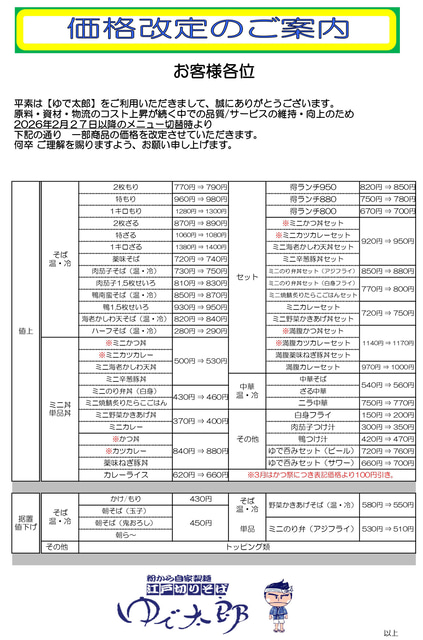 関東地方を中心に立ち食いそば・うどんチェーン店「ゆで太郎」と「もつ次郎」を展開しているゆで太郎システムが19日、2026年2月27日(金)から「ゆで太郎」の一部商品の価格を改定すると発表しました。同社では価格改定の理由を「原料・資材・物流のコスト上昇が続く中での品質/サービスの維持・向上のため」と説明しています。