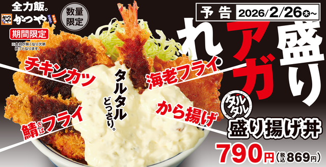 とんかつ専門店「かつや」が、4種の揚げ物に、遠慮ゼロのタルタルを豪快にかけた「タルタル盛り揚げ丼」「タルタル盛り揚げ定食」を2026年2月26日(木)から期間限定で販売を開始します。