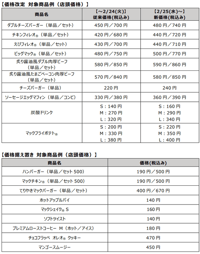 ※上記はいずれも標準店舗の一例です。各商品やセットの新価格については、2月25日(水)以降に店頭やマクドナルド公式サイト、マクドナルド公式アプリなどで確認できます。