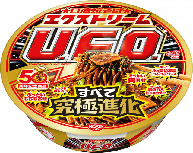1976年発売の「日清焼そばU.F.O.」は、“カップ焼そば+油そば”カテゴリーでNo.1の売上を誇るロングセラーブランド。今回、発売50周年を記念する商品の第一弾として、ソース、麺、具材、ふりかけのすべてを“究極進化”させたという「日清焼そばエクストリームU.F.O.」が登場します。