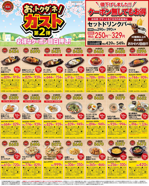 すかいらーくレストランツが運営する「ガスト」の公式Xが12日、「お、トクダ値! ガスト 第2弾 お得なクーポン目白押し!」を投稿しています。