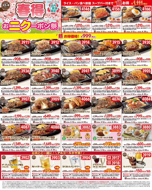「春得おニクーポン」は、超粗挽きステーキハンバーグや、炭焼き風チキンステーキ、ハンバーグ&目玉焼きにライス・パン・スープ食べ放題が付いて各1,111円(税込)、さらに999円(税込)のお得なステーキや、アルコール半額クーポン、セットドリンクバー165円(税込)など28種類が用意されています。