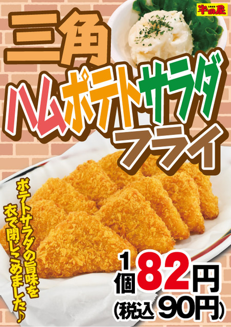 ポテトサラダをハムで挟んで衣をつけて揚げて税込90円! 大衆食堂「半田屋」が「三角ハムポテトサラダフライ」を本日18日(水)から1週間限定販売