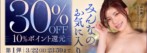 「みんなのお気に入り 30%OFFキャンペーン 第1弾」では2026年3月22日(日)23:59まで、VR作品74タイトルを含む334作品が30%OFF、10%ポイント還元で販売中です。キャンペーンガールは神木麗さん。