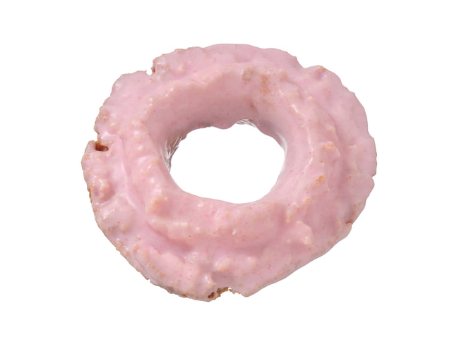 「いちごオールドファッション」は、外はサクサク、中心はしっとりとしたドーナツ生地にいちごシロップを染み込ませ、イチゴコーチングをかけたドーナツです。熱量は461kcal。たんぱく質 3.0g、脂質 32.1g、炭水化物 40.3g(糖質 39.7g、食物繊維 0.6g)、食塩相当量 0.35g。