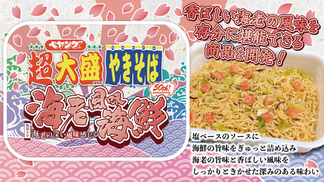 香ばしい海老の風味で春を楽しめる商品を開発。あっさりした塩ベースに海鮮の旨味をぎゅっと詰め込んだソースと海鮮具材の相性が抜群という一品です。かやくはキャベツ、カニ風味かまぼこ、イカが入っています。