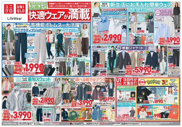 ユニクロが、「春のお出かけを心地よく! 快適ウェアが満載」チラシを2026年3月27日(金)に公開しました。
