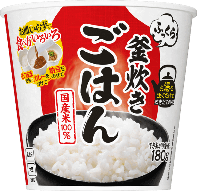 できあがり重量は約180gで、カップ内に十分なスペースがあるため、ごはんの上にレトルトカレーや牛丼の具などをのせてもこぼれず、さまざまなメニューを手軽に楽しめます。さらに、電子レンジがないオフィスやアウトドアでも活用できるほか、常温で1年間保存できるため、防災備蓄にもぴったりとしています。