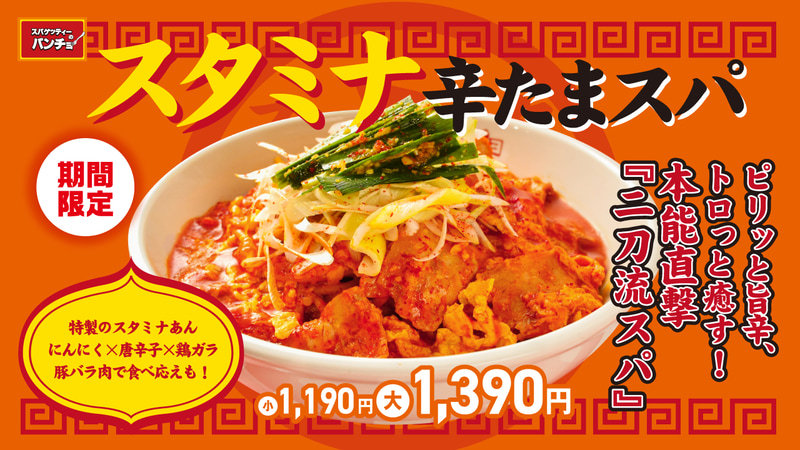 にんにくと唐辛子をじっくりと炒め、溶き卵をトロっと混ぜた特製あんを極太麺にたっぷり注いだ! スパゲッティーのパンチョが本能直撃“二刀流スパ”「スタミナ辛たまスパ」を本日16日(土)発売