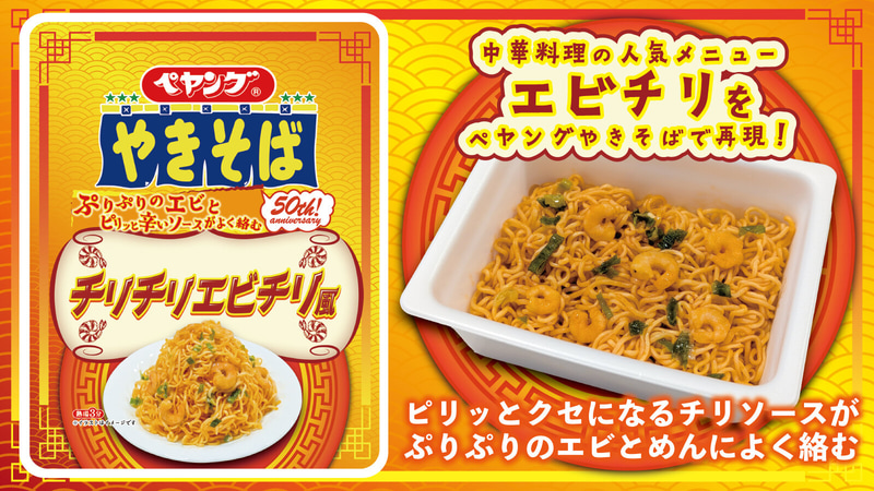 中華料理の人気メニュー「エビチリ」をペヤングやきそばで再現! ぷりぷりの海老とピリッとクセになるチリソースが麺とよく絡む「ペヤング チリチリエビチリ風やきそば」が発売