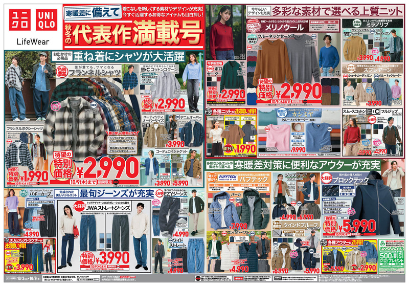 「メリノクルーネックセーター」税込2,990円、「UNIQLO and JW ANDERSON ストレートジーンズ」税込3,990円、「エアリズムブラトップ」税込1,990円! ユニクロが「秋冬の代表作満載号」チラシを本日3日(金)公開