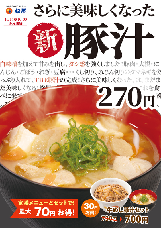 松屋の豚汁がさらに美味しくなった! 白味噌を加えて甘みを出しダシ感が強くなった「新豚汁」が本日14日(火)から43店舗でテスト販売
