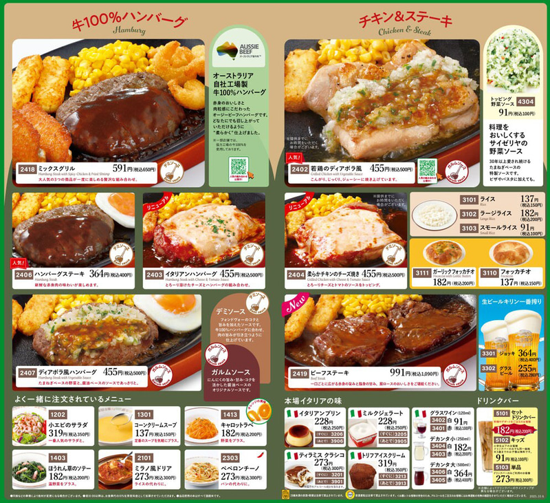 サイゼリヤがグランドメニューを本日15日(水)改定! 税込1,090円「ビーフステーキ」、税込250円「タラコフォッカチオ」が新登場