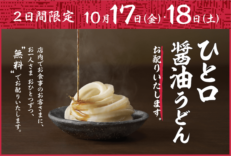 すべての店に麺職人がいる丸亀製麺ならではの体験「ひと口醤油うどん」を無料配布! 明日17日(金)から2日間実施~店内で食事をすると一人ひとつずつ無料提供