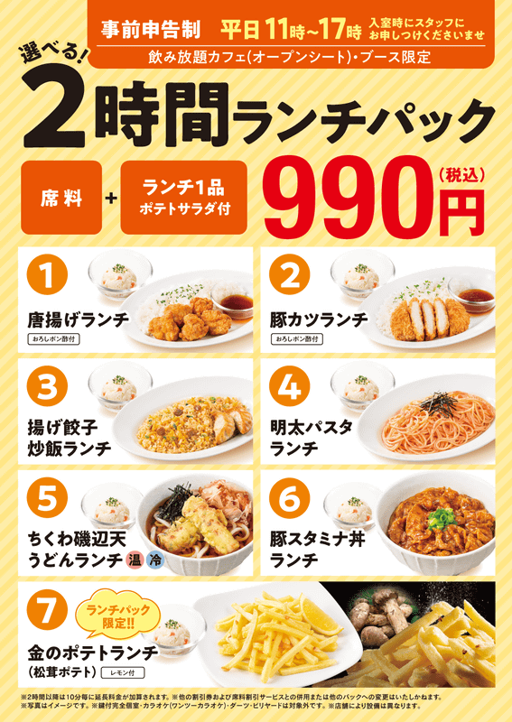 「豚カツ」や「揚げ餃子炒飯」など7種から選べるポテサラ付、ご飯大盛無料ランチにドリンクバー・ソフトクリーム食べ放題の席料2時間込みで税込990円! 「快活CLUB」が43店舗で「選べる2時間ランチパック」を実施