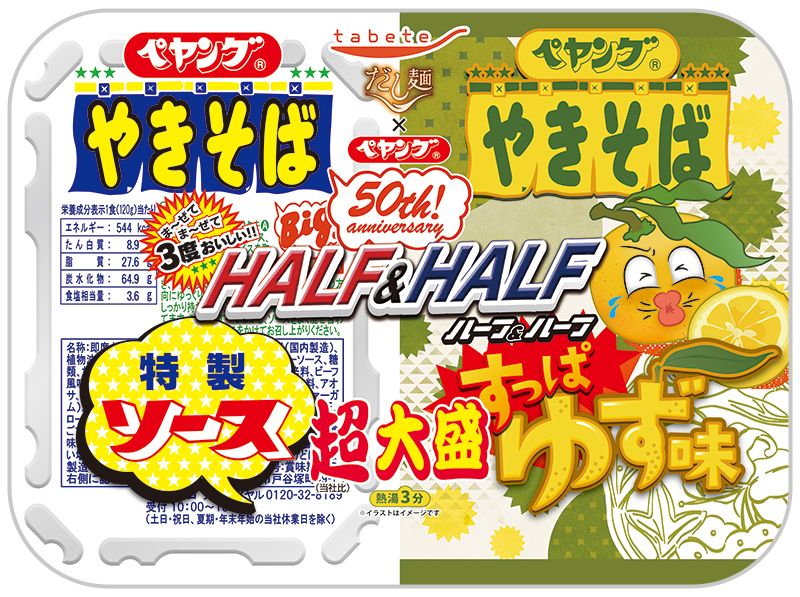 50周年のペヤングと、高知県産風味豊かなゆず皮のすっぱいソースのハーフ&ハーフで1,044kcal! 個々でも、混ぜても一食で三度楽しめる! 「tabete だし麺×ペヤング超大盛やきそばハーフ&ハーフすっぱゆず」が発売