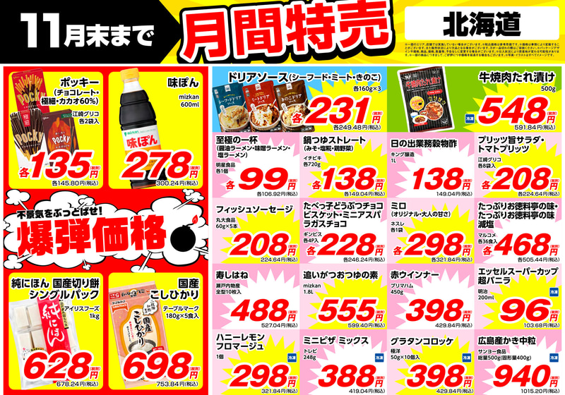 業務スーパーが11月の月間特売チラシ公開! 「プリマハム お徳用赤ウインナー 450g」税込429円、「天然水 500ml」税込31円、「国産こしひかり180g×5食」税込753円、「国産切り餅1kg」税込678円などの爆弾価格も